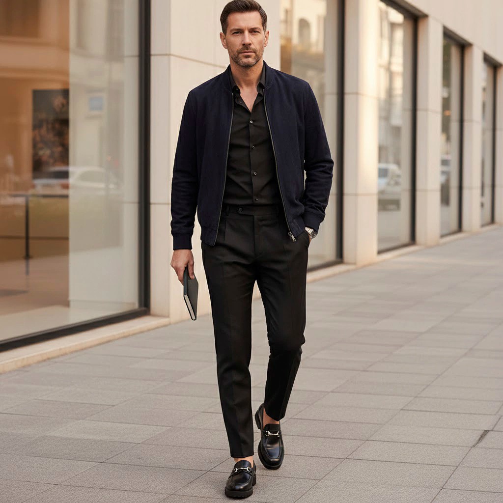 Sastrería moderna: pantalón negro o gris, campera bomber o camisa minimal.